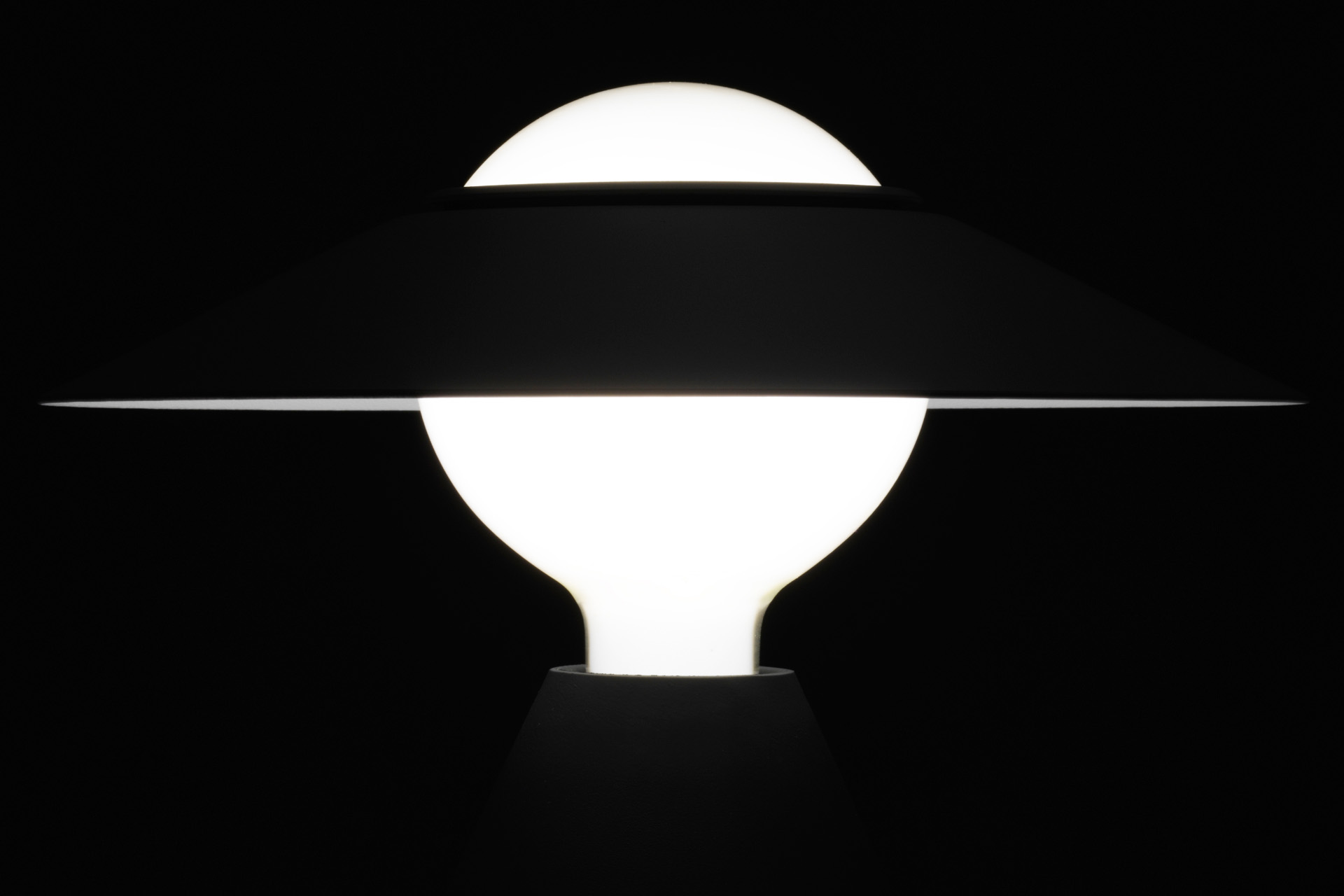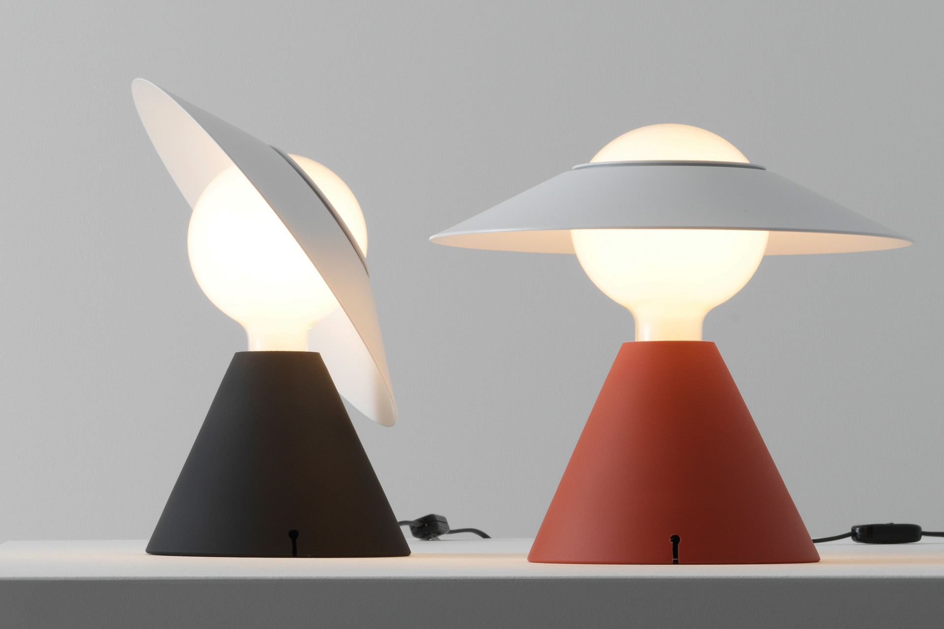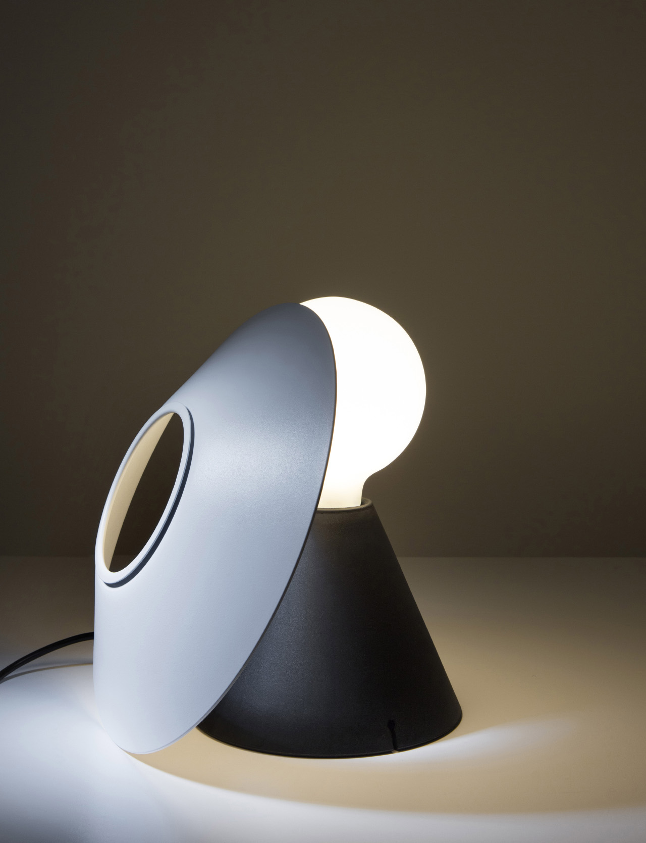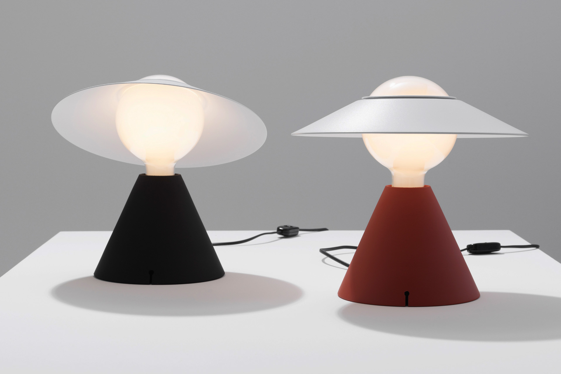 Base cónica de silicona en negro o rojo ladrillo. Disco orientable en aluminio pintado blanco. Lámpara globo LED 11W 2700K E27 incluida.