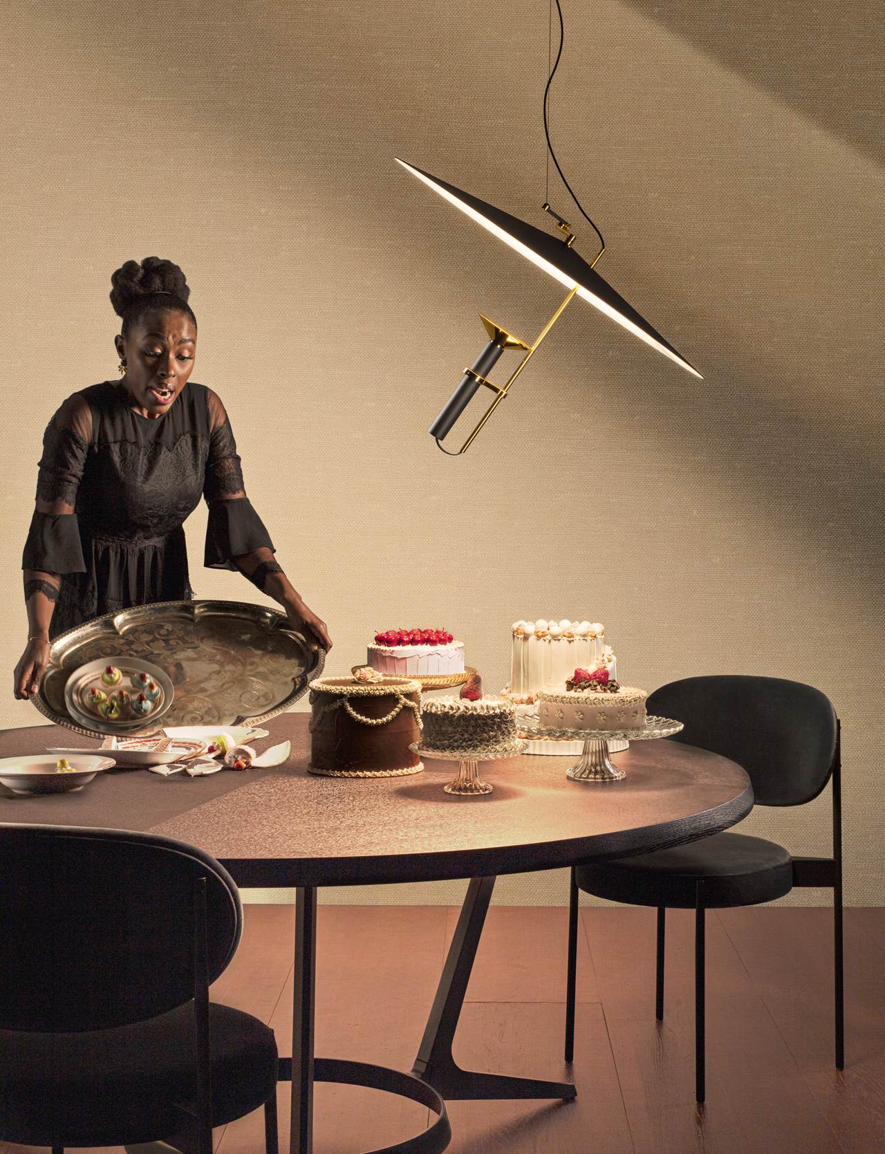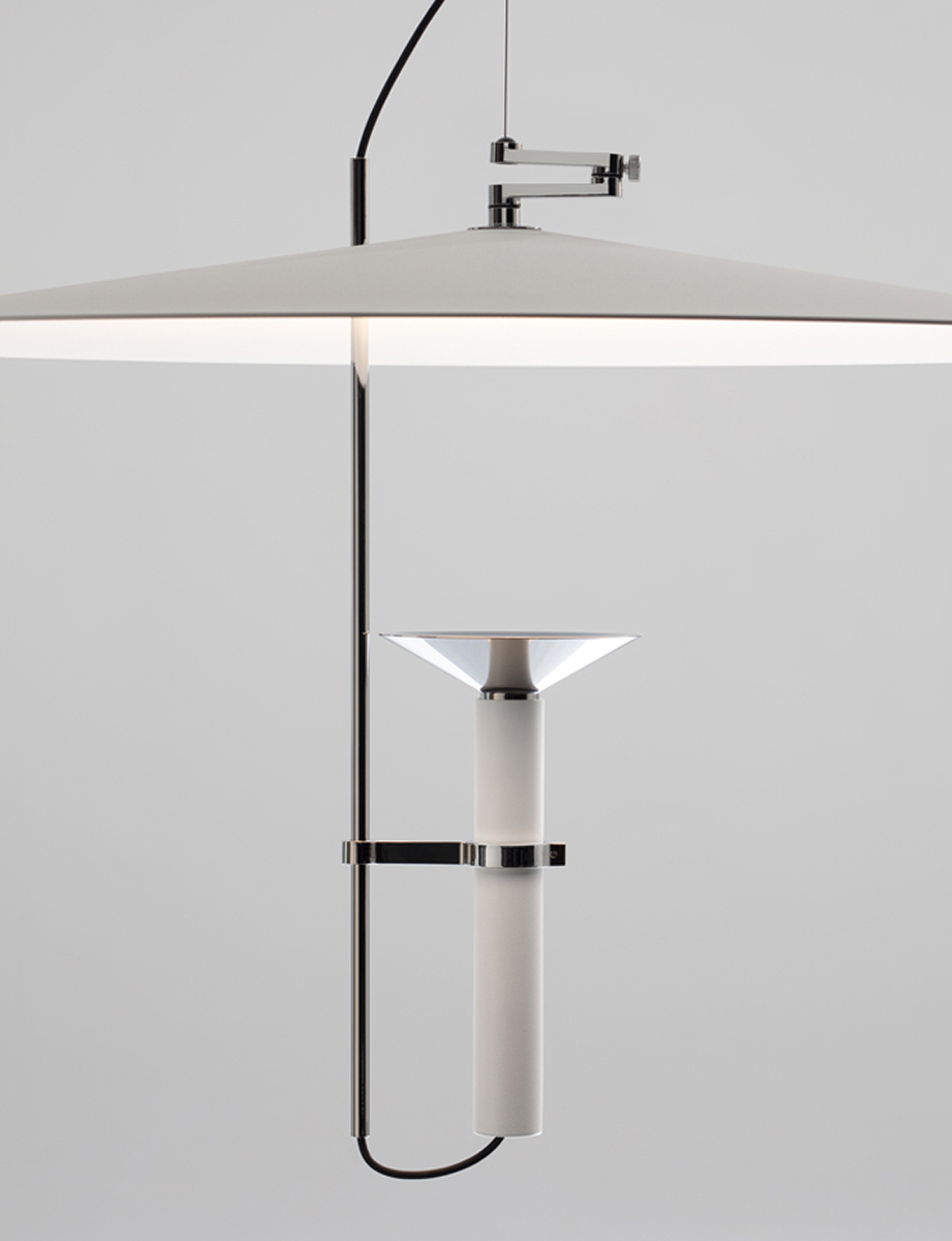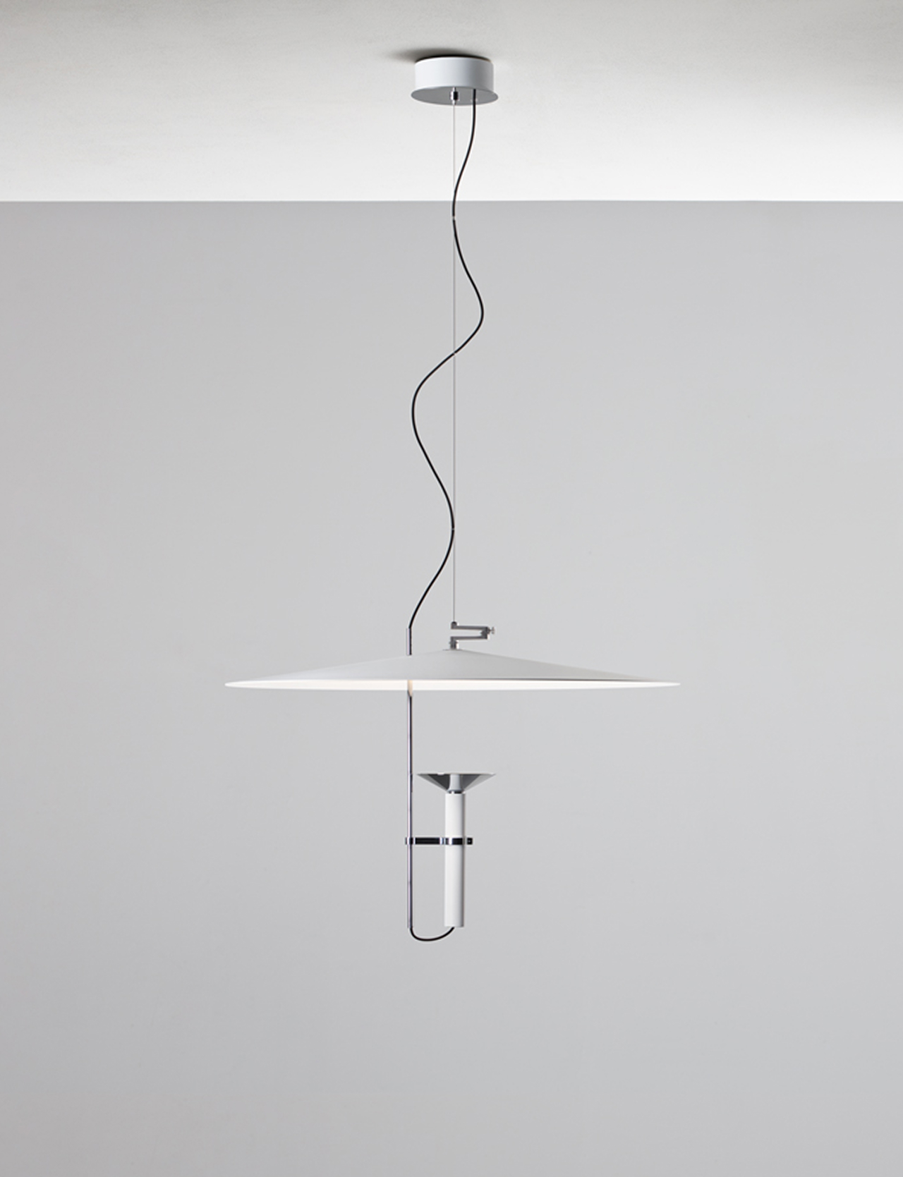 A sleek, lightweight suspension lamp with minimalist proportions and soft light emission. The light is projected onto a directional reflective disc, which in turn directs it comfortably onto the surface. A patented jointed balancing system allows easy adjustment of the angle of the disc and therefore the light beam.