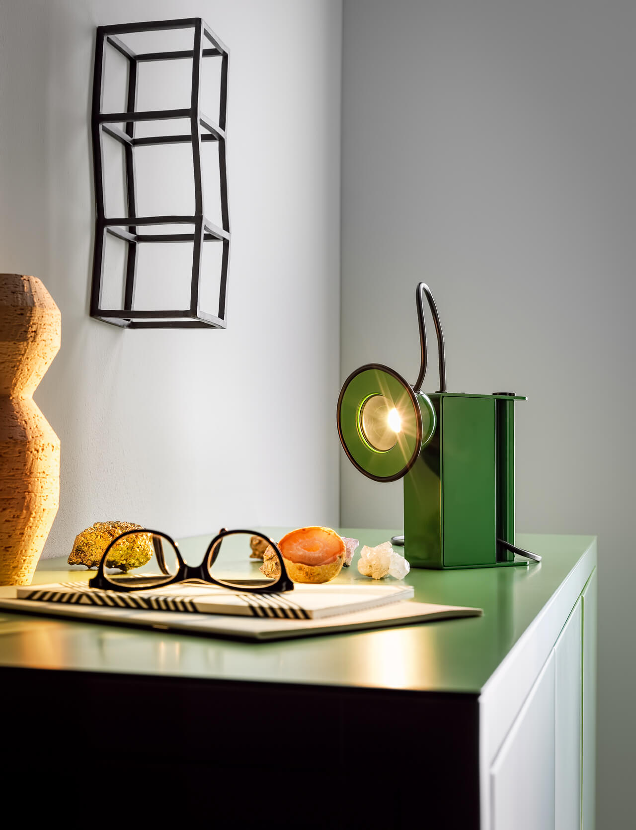 Minibox de mesa está compuesta por un cuerpo metálico, un cómodo agarre y un irreverente ojo brillante, que remite a la estética de las lámparas de los mineros. El acoplamiento magnético del cabezal permite orientar la luz, haciéndola adecuada para cualquier lugar, incluso el más inesperado.