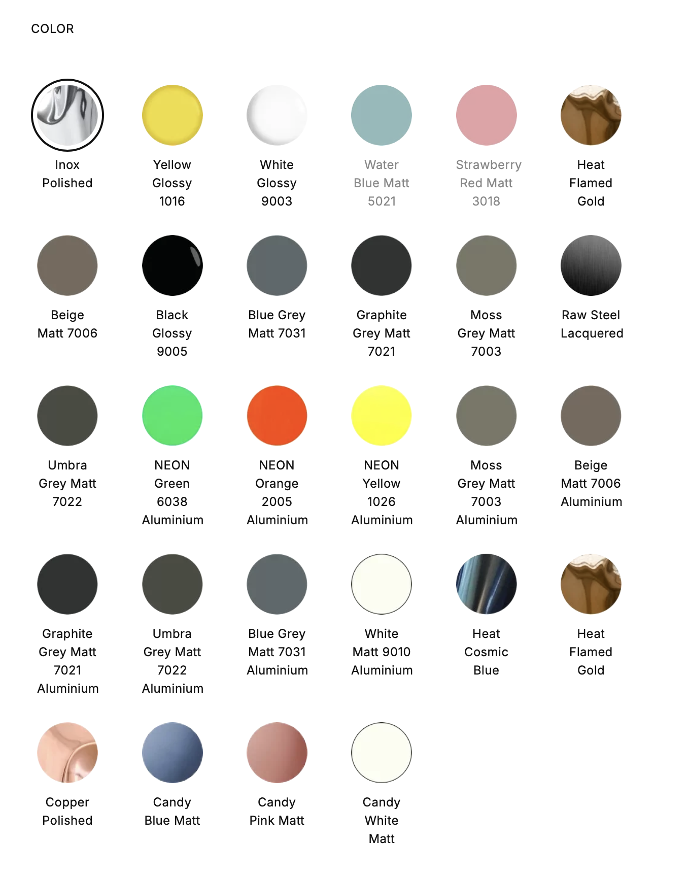 | Color | Beige Matt 7006, Beige Matt 7006 Aluminium, Black Glossy 9005, Blue Grey Matt 7031, Blue Grey Matt 7031 Aluminium, Candy Blue Matt, Candy Pink Matt, Candy White Matt, Copper Polished, Gradient Emerald, Graphite Grey Matt 7021, Graphite Grey Matt 7021 Aluminium, Heat Cosmic Blue, Heat Flamed Gold, Inox Polished, Moss Grey Matt 7003, Moss Grey Matt 7003 Aluminium, NEON Green 6038 Aluminium, NEON Orange 2005 Aluminium, NEON Yellow 1026 Aluminium, Raw Steel Lacquered, Strawberry Red Matt 3018, Umbra Grey Matt 7022, Umbra Grey Matt 7022 Aluminium, Water Blue Matt 5021, White Glossy 9003, White Matt 9010 Aluminium, Yellow Glossy 1016 |