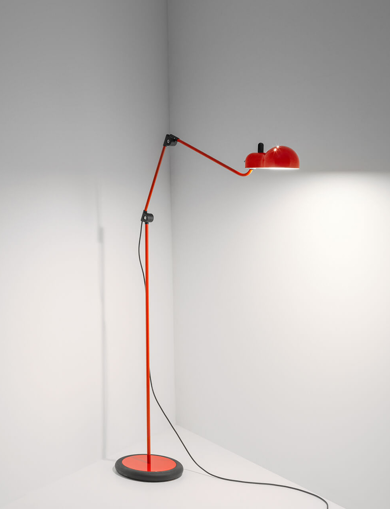 Topo is a fascinating object of automotive inspiration: the slits on the metal shell are reminiscent of the vents on a 1960s sports car, whilst the lampshade’s form corresponds to the casing of the classic E27 bulb it contains, like the bodywork encasing an engine. The jointed metal arms allow the lamp to be extend or retracted at will.