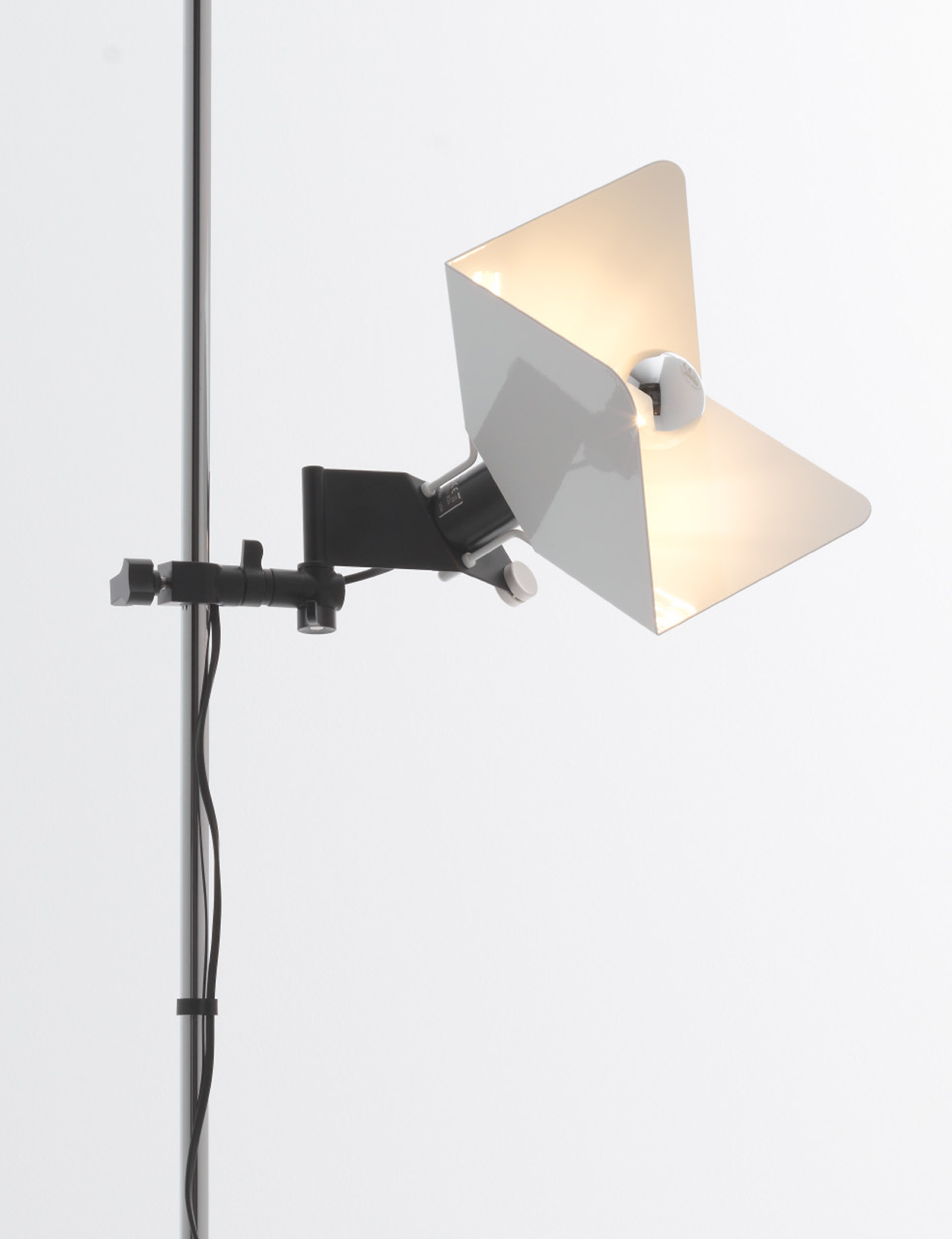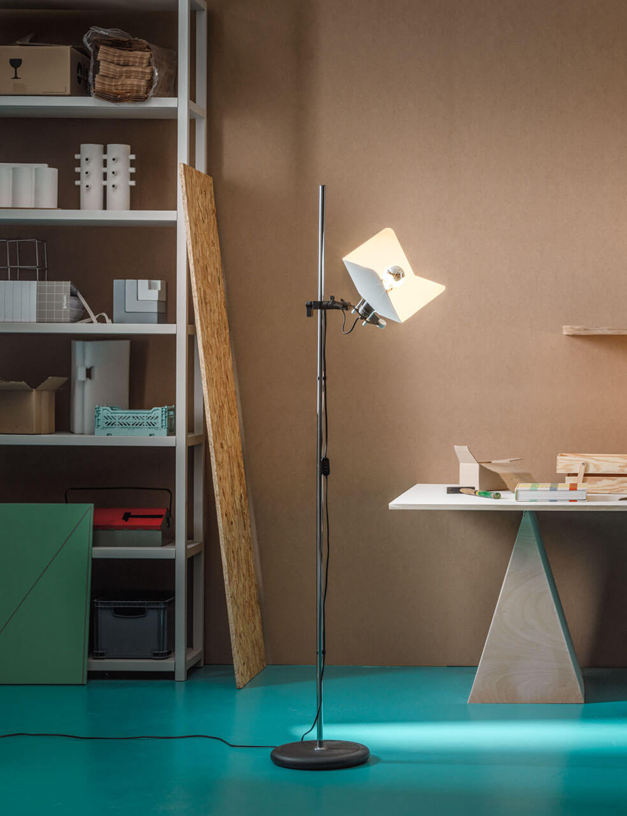 The Triedro floor lamp is reminiscent of lighting from a photo shoot. Thanks to the contoured and bent metal lampshade, comprised of three parts, the light from the silver-domed LED bulb reflects without glare. A vast flexibility of movement is guaranteed by the supporting double joint, which allows the light source to rotate, incline and slide along the steel stem secured to the solid, circular base.