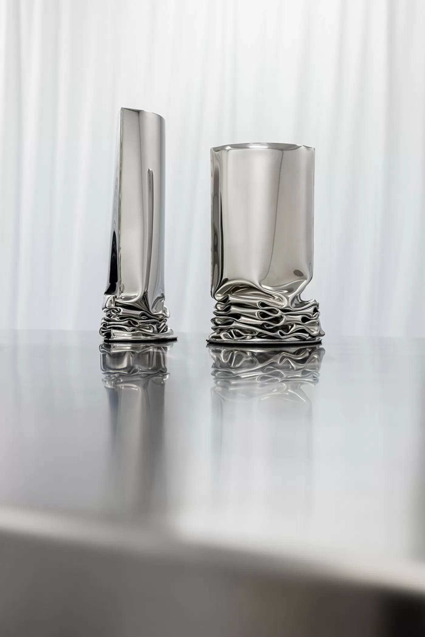 Los JARRONES CRASH reflejan la técnica de la «pérdida controlada del control». Los jarrones abrazan la noción de deformación. Agrupados, abren una narrativa de simplicidad, respaldada por bases irregulares que muestran la viveza del acero.