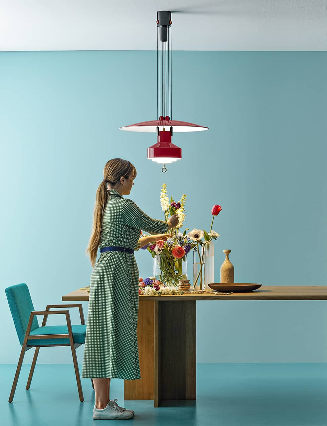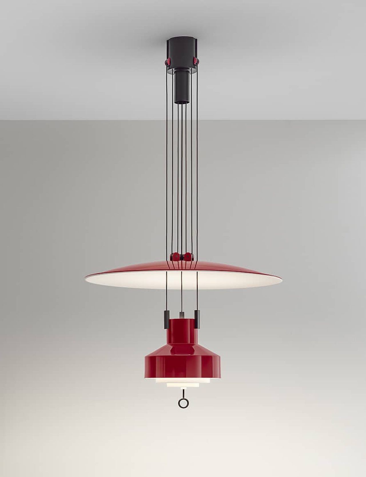 Diseño de 1957 realizado en dos ejemplares únicos para la Cámara de Comercio de Milán, ahora Saliscendi se rediseña con fuentes LED dimmables. Una joya tecnológica oculta para la mayoría y finalmente revelada, Saliscendi es una lámpara regulable en metal de doble emisión. El cuerpo luminoso y el disco reflectante se deslizan silenciosamente a lo largo de los cables, moviéndose a través de un sistema de poleas y asegurando una iluminación perfectamente modulada. Los dos elementos, moviéndose en sentido inverso, pueden difundir más luz directa o indirecta en función de la distancia que los separe.