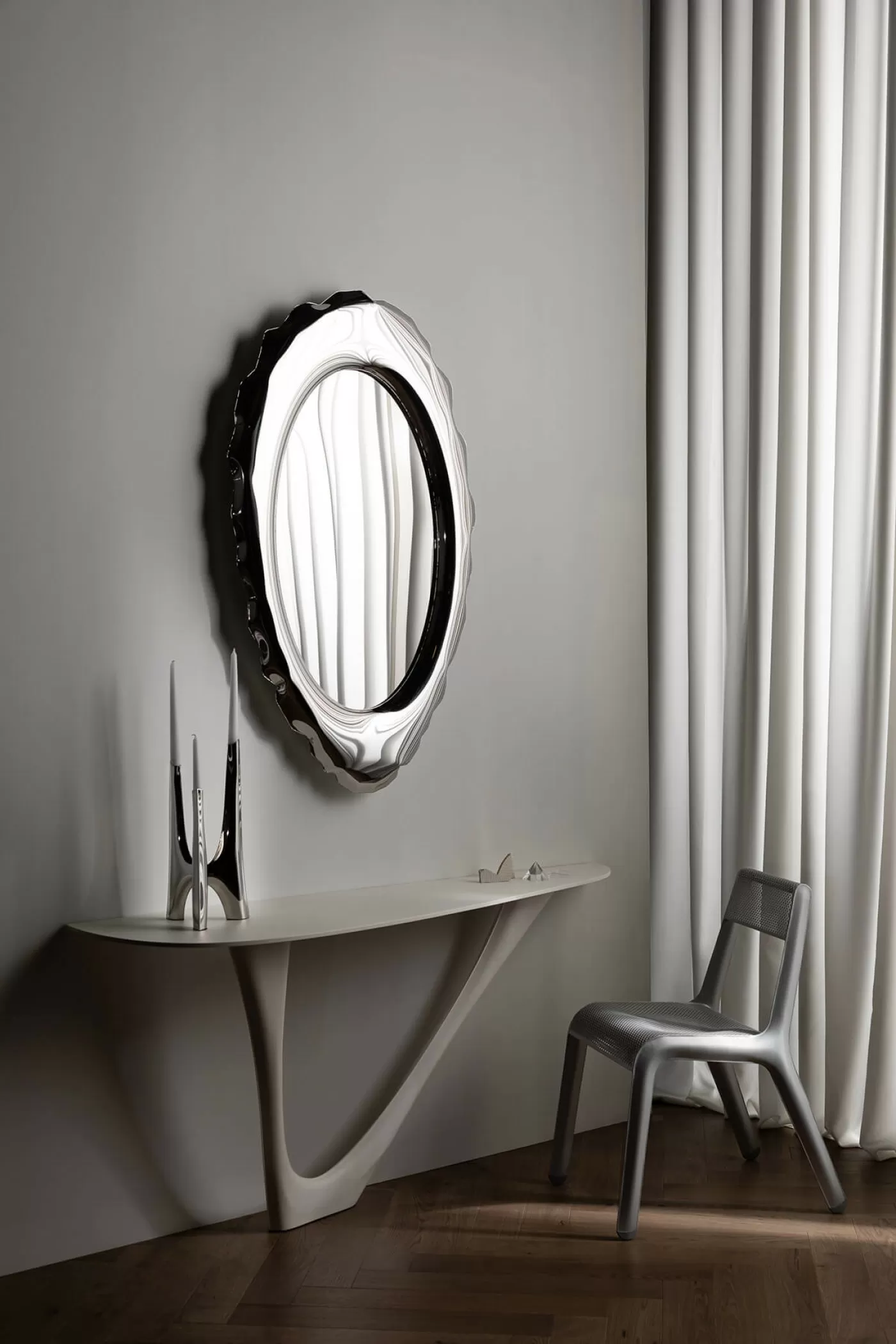 TRIGLAV es un portavelas de acero inspirado en altas y esbeltas bóvedas góticas. Sus tres brazos de diferentes alturas son similares a construcciones de torres modernas, delicadas en su verticalidad pero estables e inflexibles. Gracias a su forma asimétrica, el candelabro TRIGLAV está lleno de oportunidades inesperadas. Dependiendo del punto de vista, presenta diferentes aspectos revelando así un sin número de misteriosas caras.