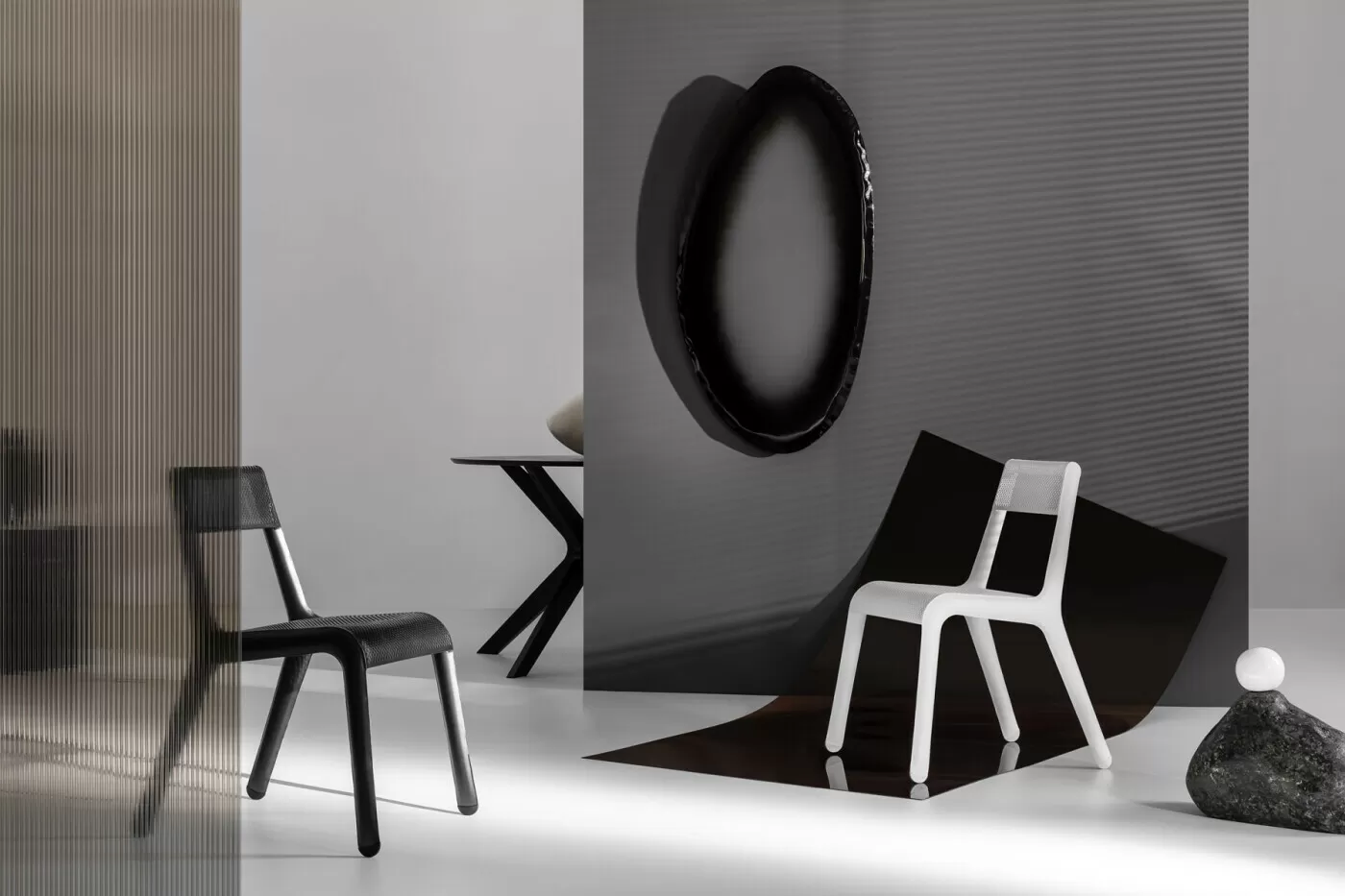 ULTRALEGGERA es una silla manifiesto. Su forma final y propiedades, destacadas por su monomaterialidad, funcionan como una lupa que enfoca cuestiones complejas de los campos de la ecología, la tecnología y la economía.
