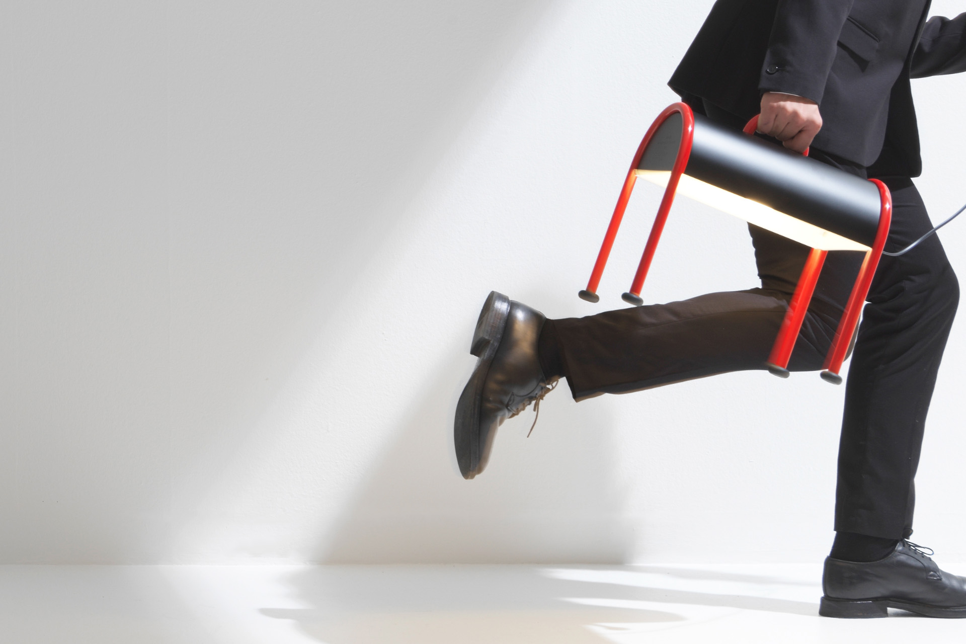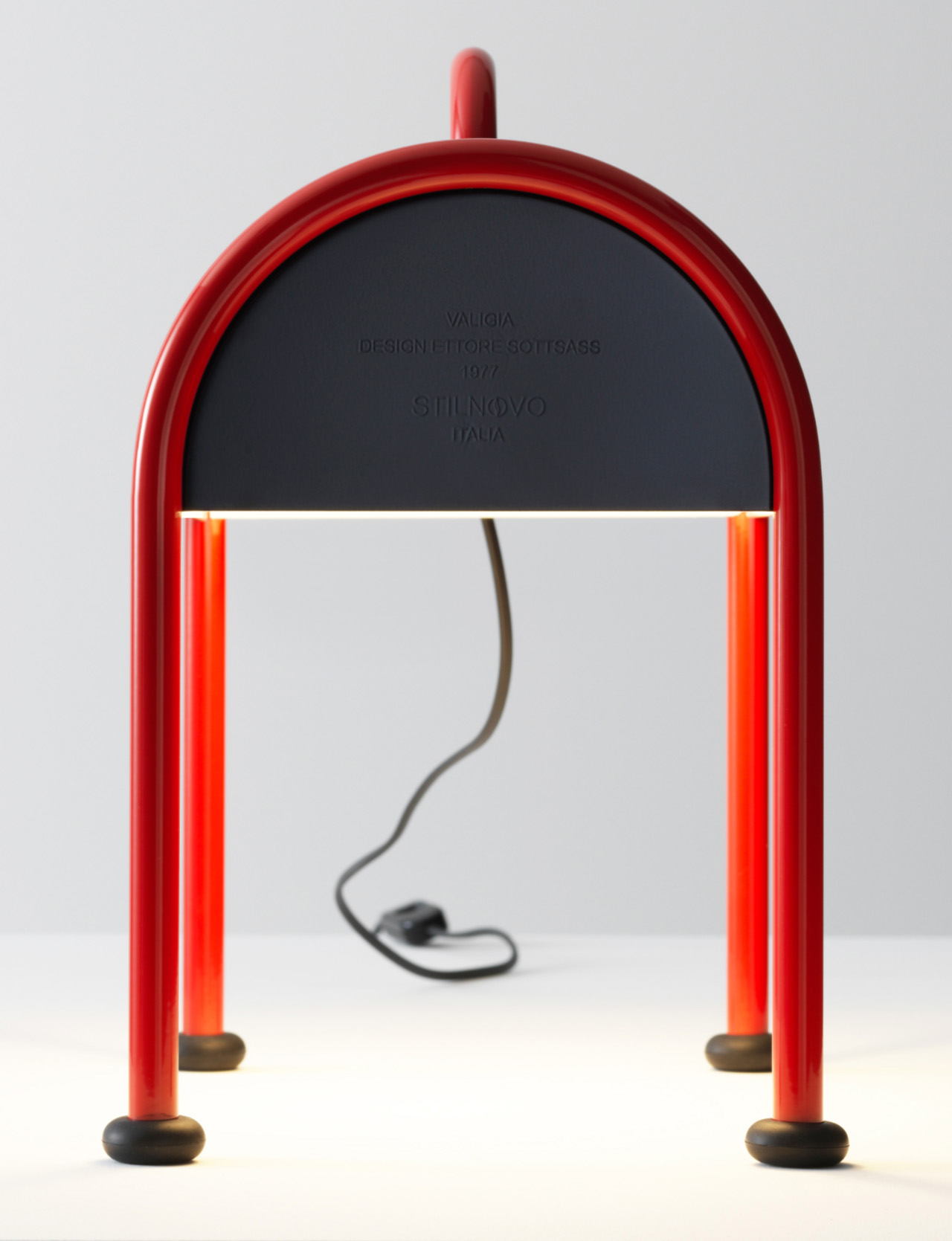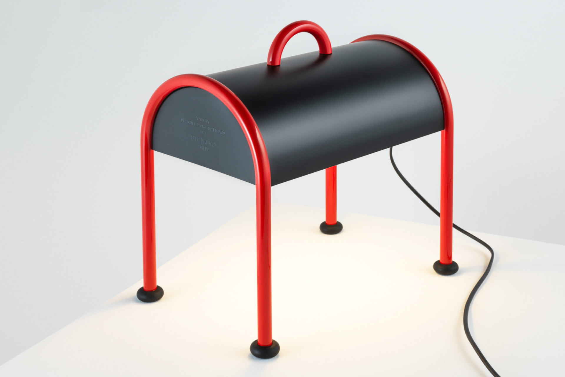 Arcos de sujeción y asa en metal pintado rojo brillante. Pantalla abovedada de metal pintado bicolor negro mate en el exterior, blanco en el interior. Bombilla LED 7W 2700K E27 incluida.